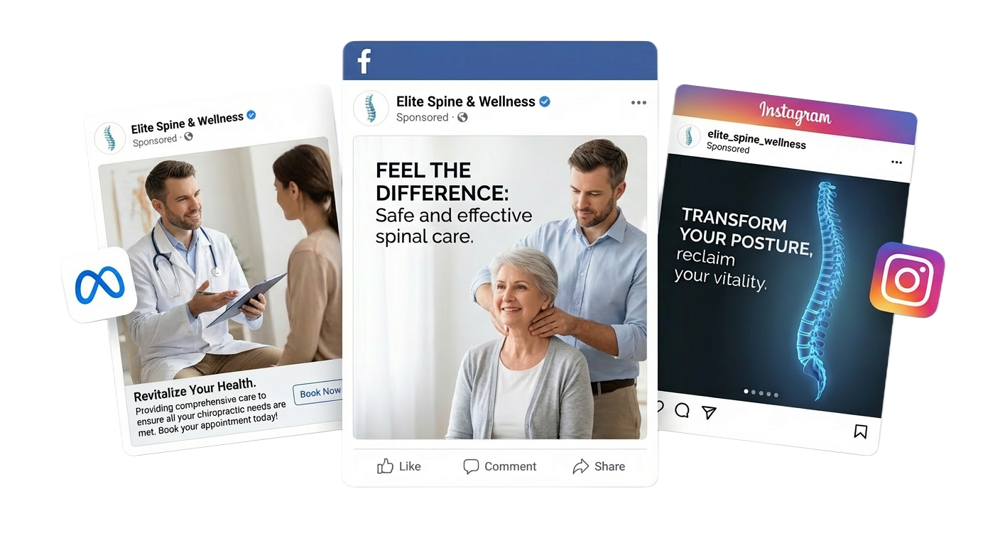 Custom-designed ads targeting people in your area actively seeking chiropractic care. We write the copy, design the creatives, and manage the campaigns.