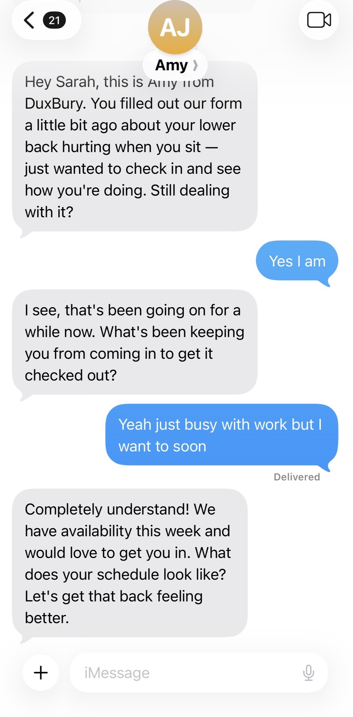 Not ready to book yet? No problem. Leads are nurtured over time with personalized text sequences that keep your practice top-of-mind until they're ready.